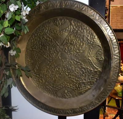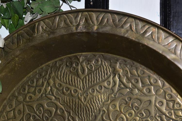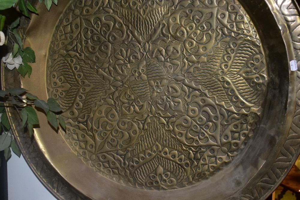 Lot 101 of 616: A large Eastern brass wall charger with embossed stylised detail, diameter 90cm.