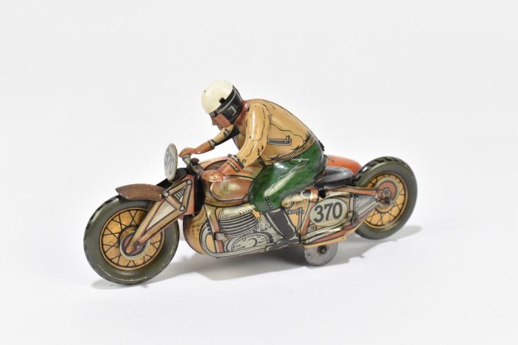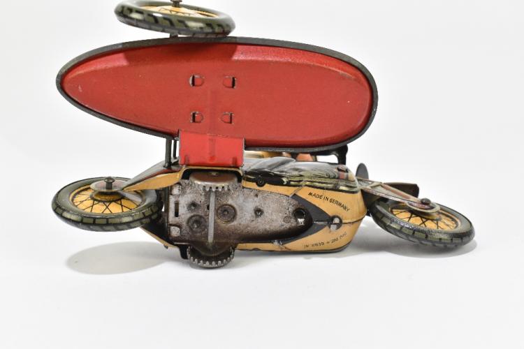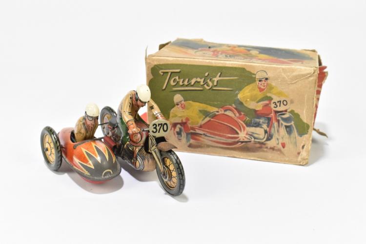 Lot 4 of 961: CKO KELLERMANN; a German tinplate clockwork motorcycle and sidecar 'Tourist', no.370, with rider and passenger, length 14cm. PROVENANCE: The Collection of Jack Tempest.