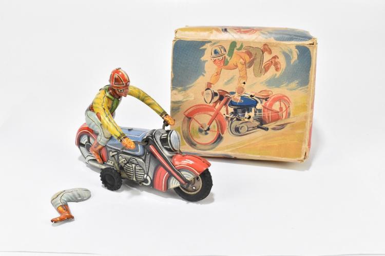 Lot 8 of 961: GREPPERT & KELCH (GOSO); a West German tinplate clockwork motorcycle and acrobatic rider, with original box (2). PROVENANCE: The Collection of Jack Tempest.