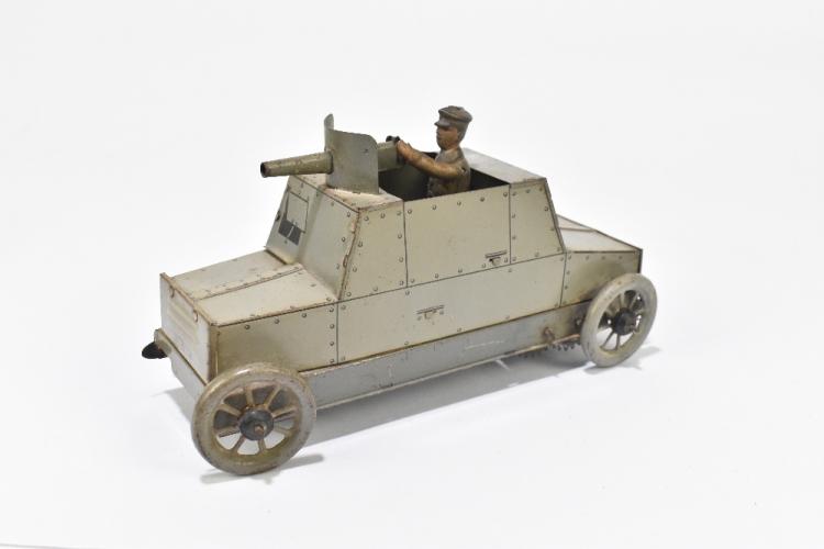 Lot 12 of 961: BURNETT LTD; a 1930s English tinplate clockwork armoured vehicle, length 18.5cm. PROVENANCE: The Collection of Jack Tempest.