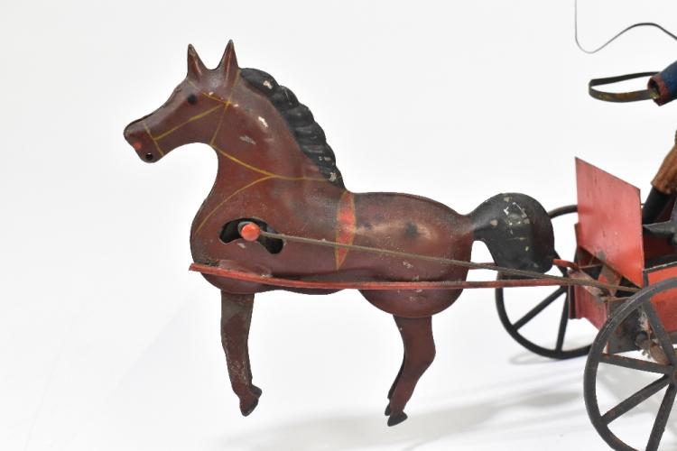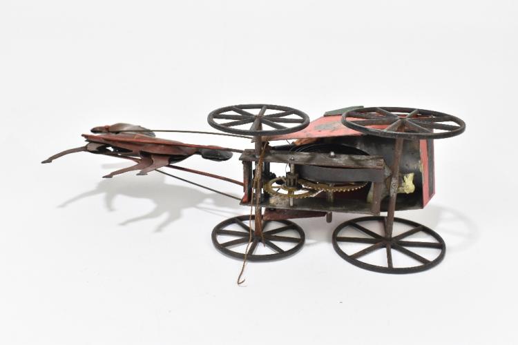 Lot 26 of 961: A vintage American tinplate clockwork toy modelled as a horse and cart with rider, the back of the cart with label stating patented March 7th 1871, length 27cm. PROVENANCE: The Collection of Jack Tempest.