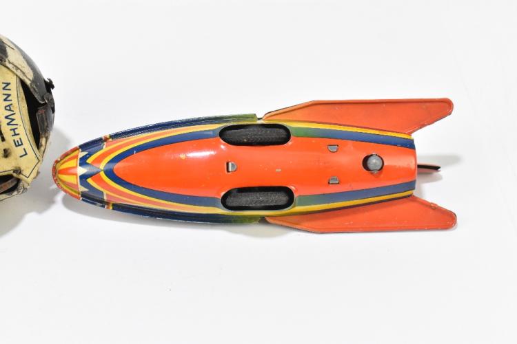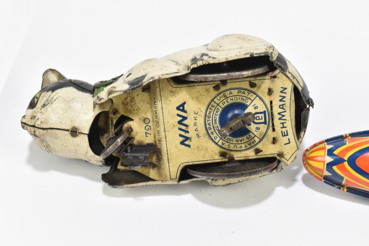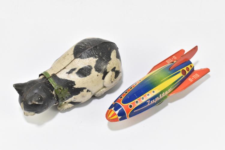 Lot 40 of 961: LEHMANN; a tinplate clockwork cat 'Nina', with articulated head, length 18cm, with a West German tinplate model friction rocket, length 19cm (2). PROVENANCE: The Collection of Jack Tempest.