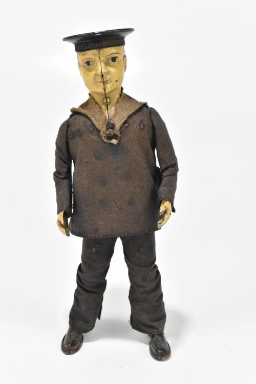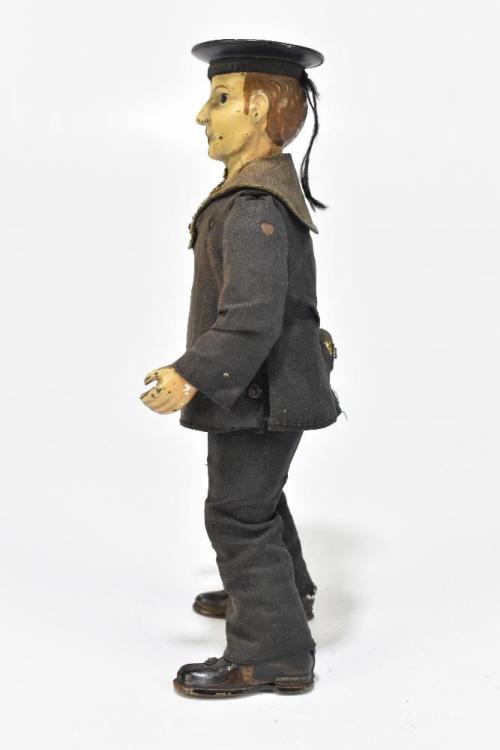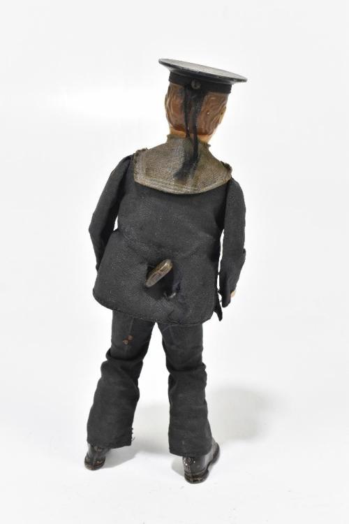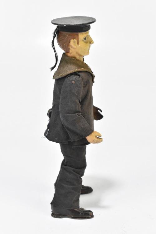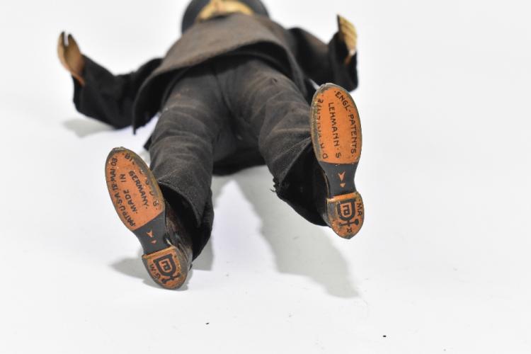 Lot 44 of 961: LEHMANN; a tinplate clockwork figure of a dancing sailor c1910, with cotton clothes and hat marked for H.M.S Dreadnought, height 19cm. PROVENANCE: The Collection of Jack Tempest. This is possibly the example illustrated in Jack's book 'Collecting Tin Toys', page 82.