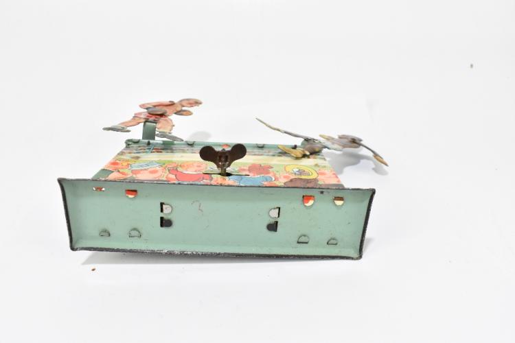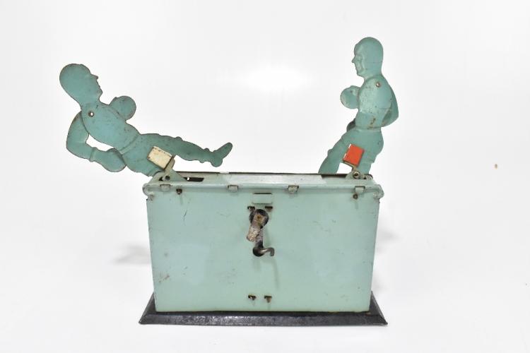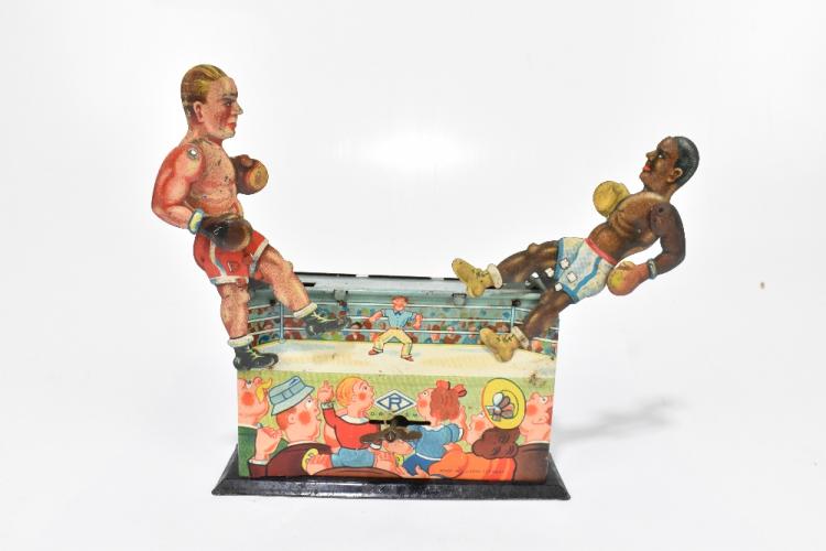 Lot 53 of 961: A German tinplate clockwork boxing toy, modelled with two articulated boxing figures supported on a rectangular stand, made in US zone Germany, height 18cm. PROVENANCE: The Collection of Jack Tempest.
