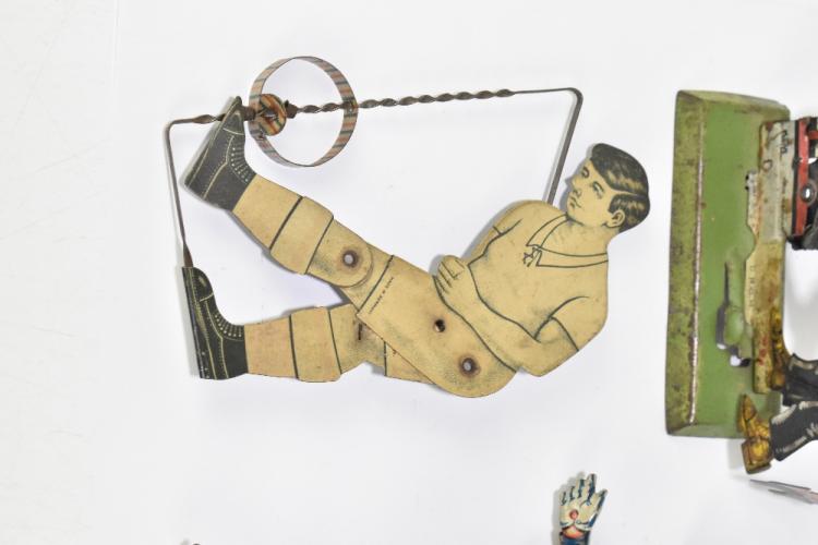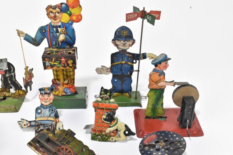 Lot 56 of 961: A collection of nine tinplate mechanical toys comprising a Gely mechanical 'Test your Strength' toy, height 17cm, a clockwork balloon and toy seller with moving eyes, raising arms and pendulum monkeys, a Gely policeman, a cutler toy, mechanical footballer, and a hand operated train, cat and dog group, policeman and spark-wheel with lithograph detailing (9). PROVENANCE: The Collection of Jack Tempest.