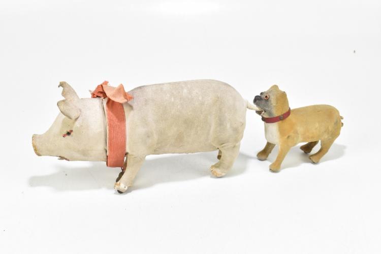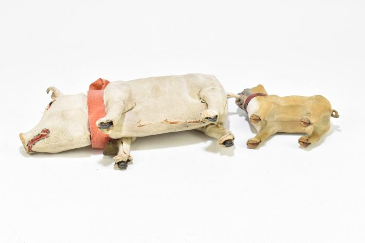 Lot 70 of 961: ROULLET & DECAMPS; a late 19th/early 20th century French clockwork automaton model of a pig and dog, the oinking pig and walking dog, the pig with kid leather covering and red collar with a smaller dog attached to the tail, length 43cm. PROVENANCE: The Collection of Jack Tempest.