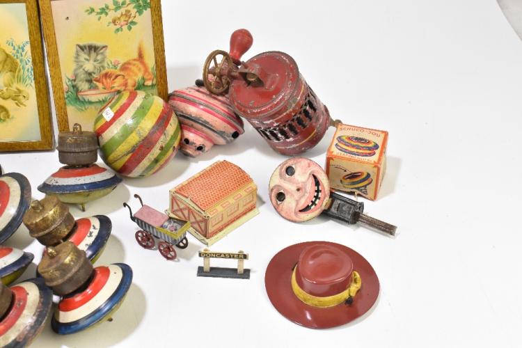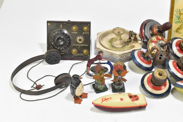 Lot 74 of 961: A collection of vintage tinplate toys including a German steam driven model fountain, a Hughes cake & biscuits tin modelled as a radio and headphones, a gyroscope, two Chad Valley kitten photograph frames, various spinning tops, a Schuco 1015 boat (incomplete), etc. PROVENANCE: The Collection of Jack Tempest.