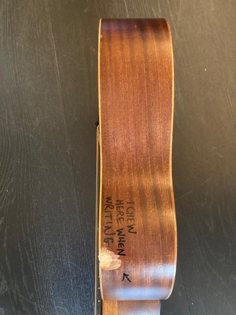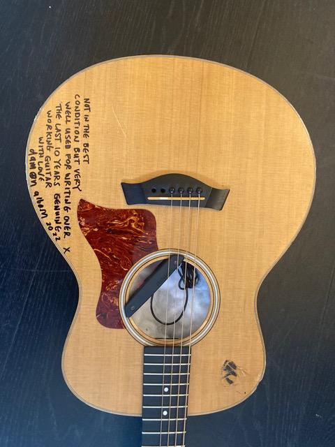 Lot 39 of 43: DAMON ALBARN; a personal Taylor acoustic guitar with inscription, Damon Albarn's teeth marks and signature. Inscription reads 'Not in the best condition, but very well used for writing over the last ten years, genuine working guitar, with love Damon Albarn 2022 x' and 'I chew here when writing'.