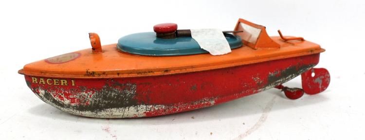 Lot 209 of 995: An early to mid-20th century Sutcliffe 'Racer 1' tinplate boat, length 23cm.