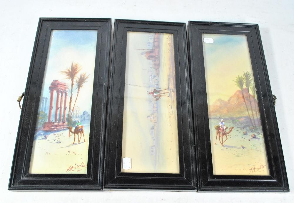 Lot 343 of 995: HA LINTON (early 20th century); a set of three Orientalist watercolours, each depicting a man upon a camel in Middle Eastern landscape, signed lower right, 37 x 12cm, framed and glazed (3).