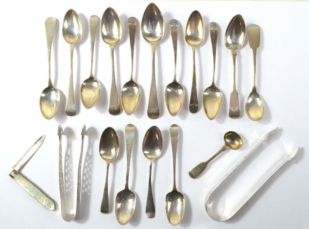 Lot 651 of 995: A small group of hallmarked silver comprising various teaspoons, a single salt spoon, two pairs of sugar tongs and mother of pearl handled pen knife, silver approx 8.3ozt.
