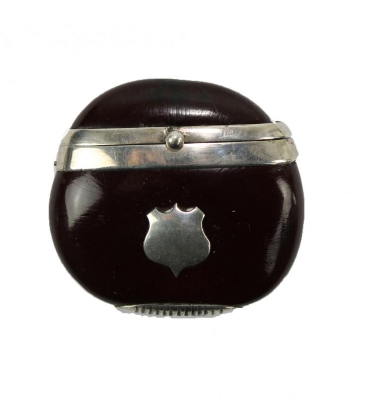 Lot 654 of 995: A Victorian white metal mounted chestnut vesta case with hinged lid, applied vacant shield shaped cartouche and striker to the base, apparently unmarked, 5 x 6cm.