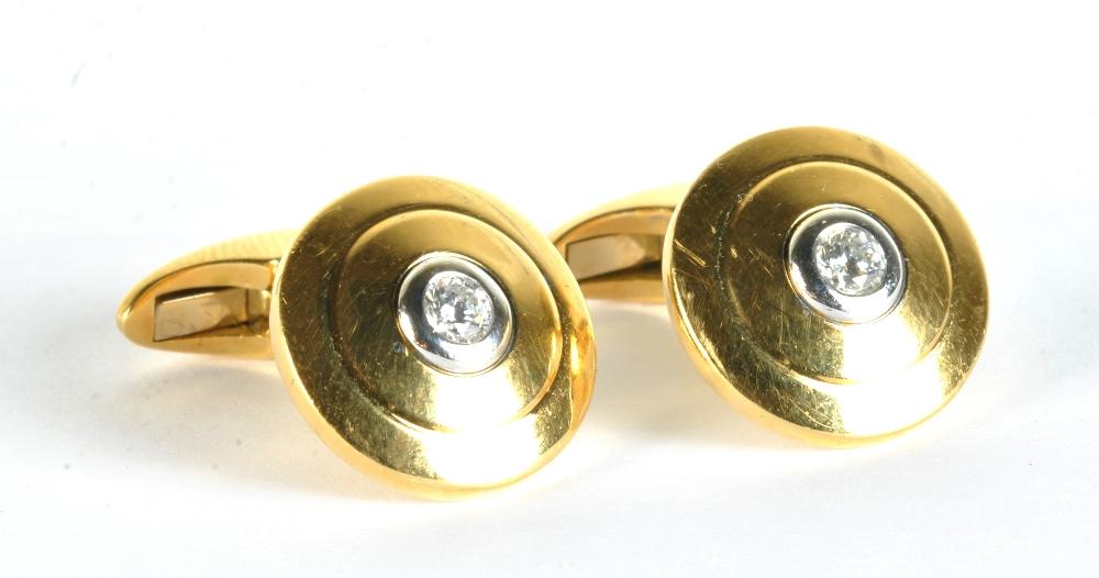 Lot 759 of 995: BOODLE & DUNTHORNE; a pair of 18ct yellow gold, white gold and diamond set cufflinks of target form, each diamond approx 0.15cts, combined approx 16.5g, presented in Boodle & Dunthorne box.