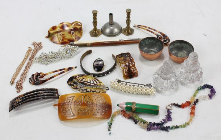 Lot 776 of 995: A mixed lot including a 9ct gold framed Blue John oval brooch, two 9ct gold chain necklaces, the longer 65cm, a tortoiseshell yellow metal inset hair clip also a Limoges ceramic scent bottle case modelled as a pencil, a bone handled dip pen, also two pressed clear glass handles, etc, gold approx 13.5g.