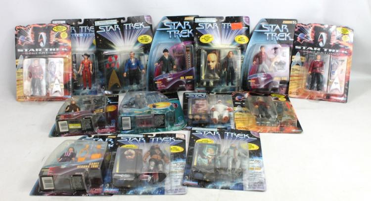 Lot 231 of 517: STAR TREK; fourteen boxed Playmates figures including James Kirk, Captain Kurn, Seska as a Cardassian, The Mugatu, Borg, Harry Mudd, Holodeck Series, Counsellor Deanna Troi as Duramgo and three Generations Series Captain Jean-Luc Picard and Admiral James T Kirk (x2).
