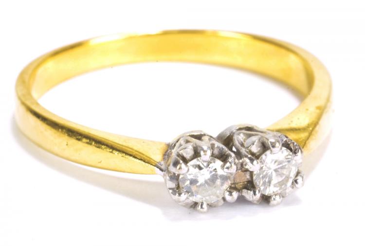 Lot 1523 of 2269: An 18ct yellow gold two stone diamond ring, 3.5g.