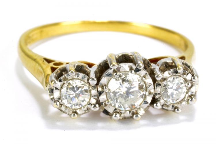 Lot 1524 of 2269: An 18ct yellow gold illusion set three stone diamond ring, the central stone weighing approximately 0.2ct, size N1/2, 4g.