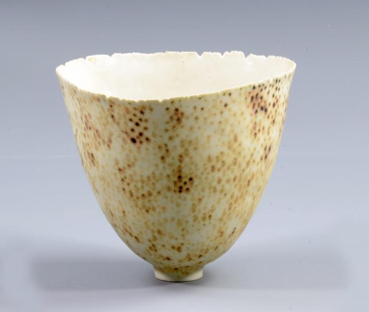 Lot 52 of 1144: MARY ROGERS (born 1929); a porcelain footed vase with serrated rim, leopard spot pattern to exterior, incised MER mark, height 12cm.