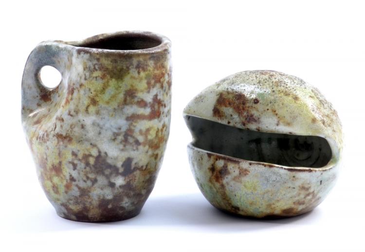 Lot 259 of 1144: ALEXANDRE KOSTANDA for Vallauris; a stoneware jug and shell form, impressed marks, tallest height 10.75cm (2). (D)