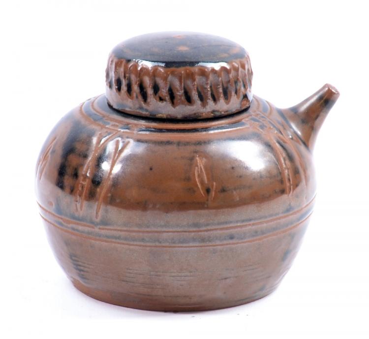 Lot 627 of 1144: MICHAEL CARDEW (1901-1983) for Abuja Pottery; a stoneware vessel with screw top lid covered in tenmoku and kaki glaze, impressed MC and pottery marks, height 9cm. (D)