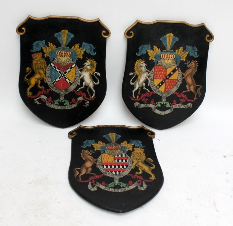 Lot 28 of 2128: Three reproduction shield armorials with gilt and painted decoration, each approx 66 x 47cm (3).