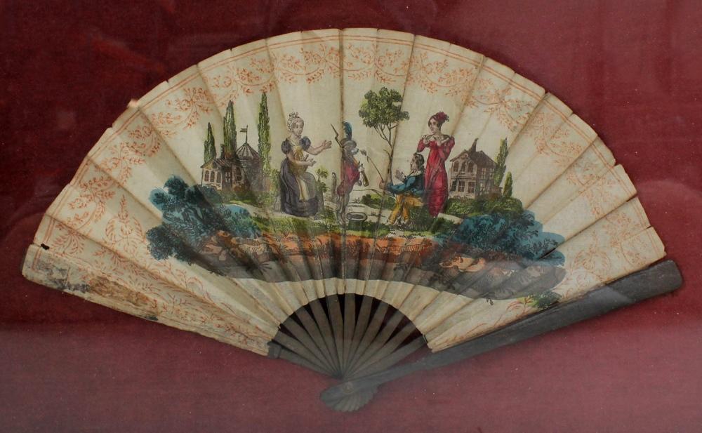 Lot 47 of 2128: An early 20th century paper transfer decorated and hand coloured fan decorated with figural scene with wooden sticks and guards, length 19cm, in glazed display case.