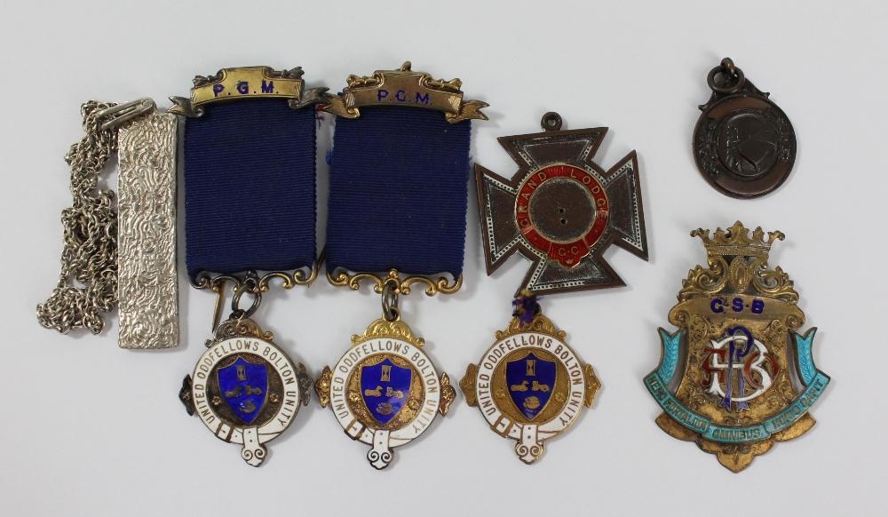 Lot 58A of 2128: Three silver gilt Masonic medals to include United Oddfellows Bolton Unity examples, a base metal example, a silver Jubilee ingot and a table tennis medallion (6).