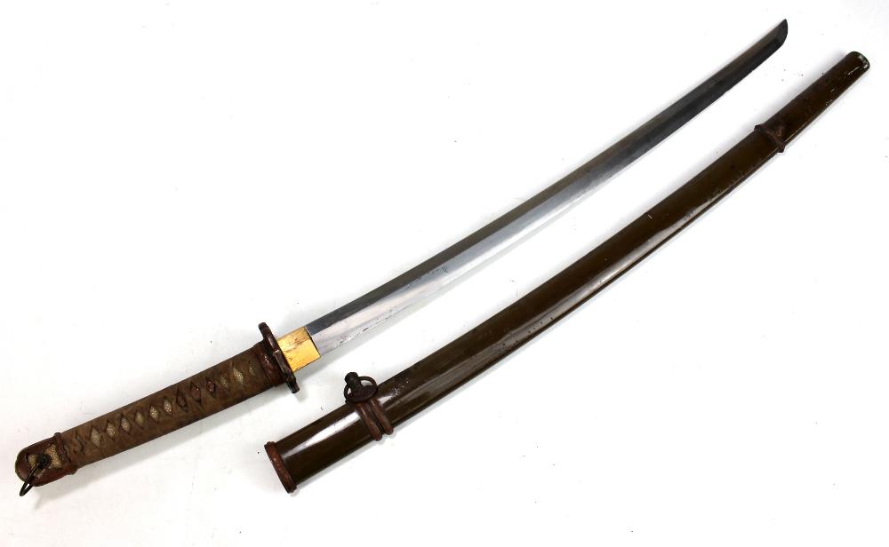 Lot 541 of 2128: A Japanese Army officer's shin-gunto with brass plate to blade base, with pierced floral motif tsuba, tape bound same grip and saru-te, length of blade approx 65cm, in metal single loop scabbard.