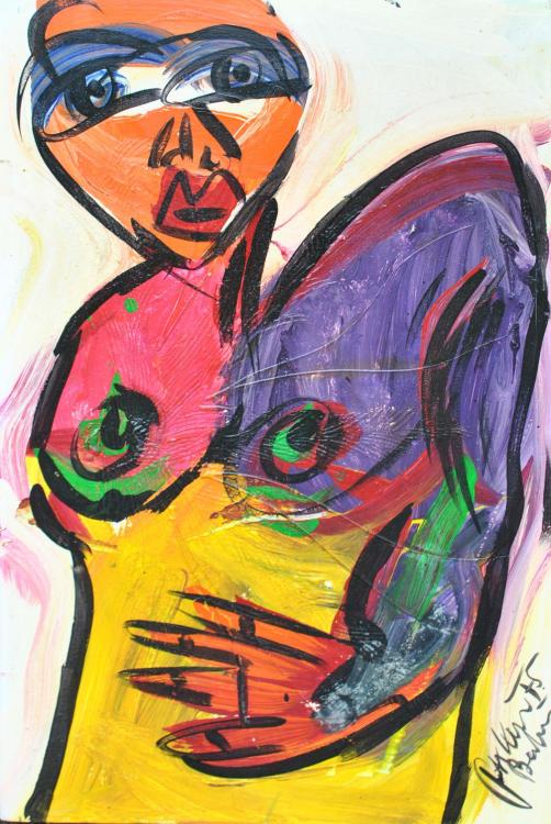 Lot 1811 of 2128: UNATTRIBUTED; oil on canvas, 'Necked...gone wild', indistinctly signed, dated '75 and indistinctly inscribed and signed verso, 92 x 51cm, unframed. (D)